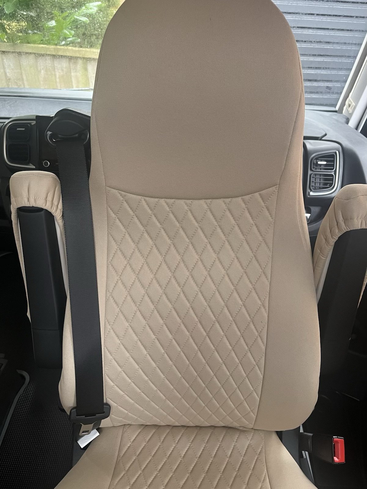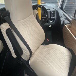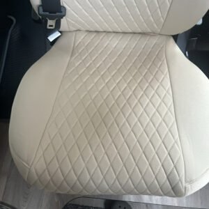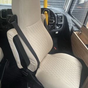 This listing is for a set of seat covers designed to fit the front seats of a Aguti GIS Liner and Milan Motorhome. The covers are made from high-quality fabric and come in a stylish Beige colour. They include headrest covers and feature adjustable straps for a secure fit.
